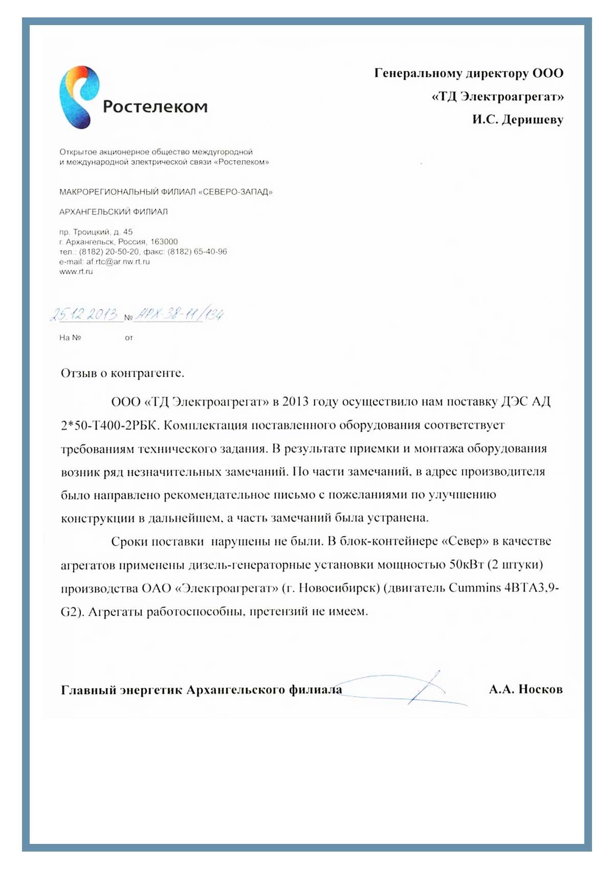 Отзыв контрагентов о компании ООО «ТД Электроагрегат» и  исполненном проекте для ОАО "Ростелеком" г. Архангельск