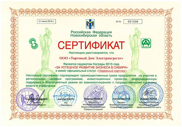 Компания «Торговый Дом Электроагрегат» по итогам 2015 года стала победителем конкурса, была награждена памятной статуэткой, дипломом конкурса «За успешное развитие бизнеса в Сибири» и сертификатом «Надежный партнер».